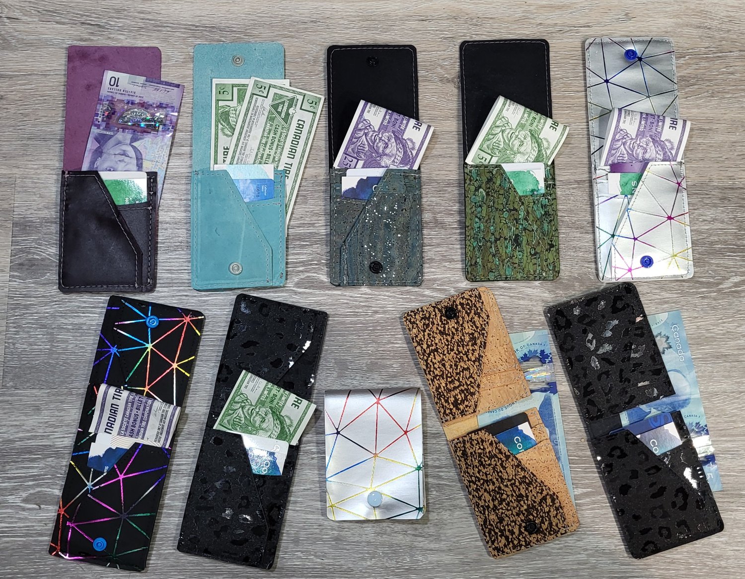 The Wormwood Wallet is a great beginner pattern. A sleek wallet with a back ID holder, 2 or 4 card slots, paper money slot or 2 back slip pockets, and 1 or 2 receipt holders. This compact, versatile wallet has instructions for 18 ways of sewing it, however the combinations are almost endless! This wallet is perfect for everyone, especially great for a night out, or quick trip up town. The Wormwood Wallet is a satisfying and quick sew, and a great scrap buster, or market filler. If you are like me, I always have so many scraps that need to be used. The included cut files make them a breeze to cut! Each of the 18 versions has a corresponding color-coded grouping in the cut files, and chart for helping hand cut.